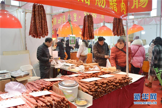 1月8日,消費(fèi)者在內(nèi)蒙古國際會展中心挑選香腸等年貨。新華社記者 王靖 攝