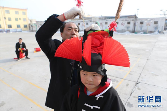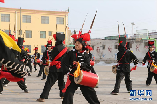 攻鼓子是發(fā)源于甘肅武威的一種民間鼓樂舞蹈,表演風格渾厚豪邁、威武雄壯,具有強烈的地域特色。2008年,涼州攻鼓子被列為第二批國家級非物質(zhì)文化遺產(chǎn)。為更好地傳承這項非物質(zhì)文化遺產(chǎn),甘肅省武威市涼州區(qū)四壩鎮(zhèn)九年制學(xué)校組建攻鼓子藝術(shù)社團,開設(shè)攻鼓子校本課,定期由當?shù)毓ス淖哟硇詡鞒腥藢W(xué)生進行指導(dǎo),推動“非遺”攻鼓子藝術(shù)教育普及。 新華社記者 耿馨寧 攝