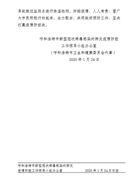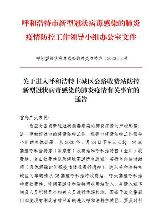 記者從呼和浩特市新型冠狀病毒感染的肺炎疫情防控工作領(lǐng)導(dǎo)小組辦公室獲悉,為應(yīng)對當(dāng)前新型冠狀病毒感染的肺炎疫情的嚴峻形勢,進一步做好呼和浩特市的疫情防控工作。從2020年1月24日下午三點起,對G6高速呼和浩特東(羅家營)收費站和呼和浩特西(金川)收費站、金山收費站以及繞城高速所有進城口實行單向臨時封閉(具體解除時間視疫情情況另行通知)。進入呼和浩特主城區(qū)的車輛請從G6高速呼和浩特收費站、呼大高速呼和浩特南收費站、呼朔高速呼和浩特南收費站駛?cè)?,并請入城車輛及人員積極配合相關(guān)人員進行體溫檢測。