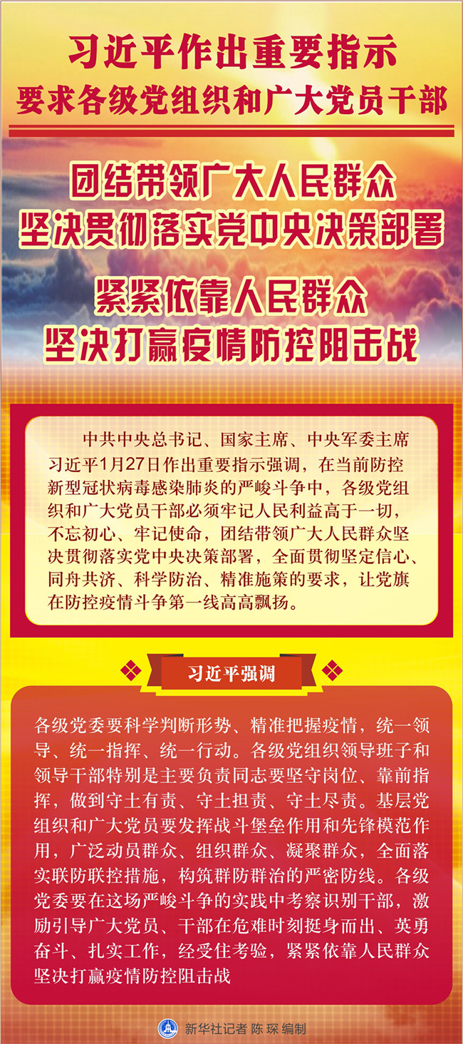 中共中央總書記、國家主席、中央軍委主席習近平27日作出重要指示強調(diào),在當前防控新型冠狀病毒感染肺炎的嚴峻斗爭中,各級黨組織和廣大黨員干部必須牢記人民利益高于一切,不忘初心、牢記使命,團結(jié)帶領(lǐng)廣大人民群眾堅決貫徹落實黨中央決策部署,全面貫徹堅定信心、同舟共濟、科學防治、精準施策的要求,讓黨旗在防控疫情斗爭第一線高高飄揚。