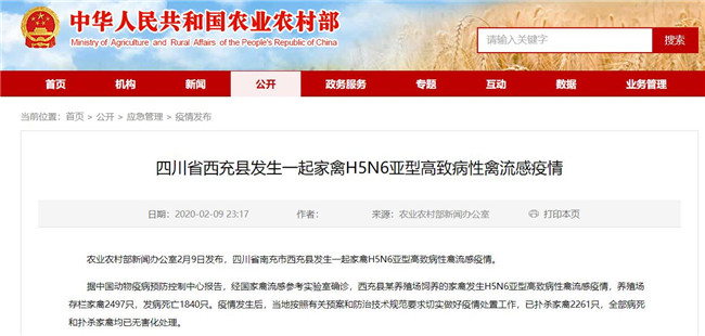 據(jù)農(nóng)業(yè)農(nóng)村部網(wǎng)站消息,農(nóng)業(yè)農(nóng)村部新聞辦公室2月9日發(fā)布,四川省南充市西充縣發(fā)生一起家禽H5N6亞型高致病性禽流感疫情。
