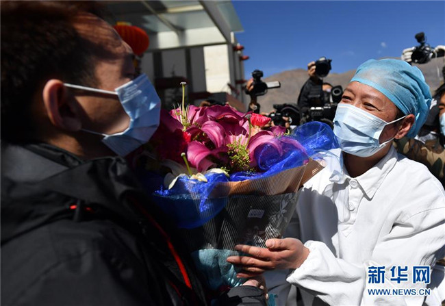 2月12日,在西藏自治區(qū)第三人民醫(yī)院,主治醫(yī)生花德米為出院患者送上鮮花。新華社記者 覺果 攝