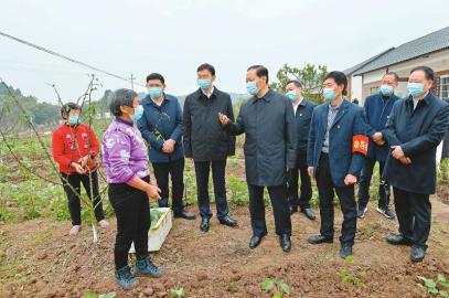 春回大地,正是春耕好時(shí)節(jié)。黎明村村民搶抓農(nóng)時(shí),有的在翻耕土地,有的正給田間作物澆水施肥,有的在播種早春玉米,一片忙碌景象。彭清華走進(jìn)村口的花椒基地,與套種茄子秧苗的村民親切交談,詢(xún)問(wèn)栽種面積、土壤墑情、生長(zhǎng)周期、市場(chǎng)銷(xiāo)路等情況。他說(shuō),一年之計(jì)在于春,切實(shí)抓好春耕生產(chǎn)對(duì)于實(shí)現(xiàn)全年豐產(chǎn)豐收意義重大。農(nóng)時(shí)不等人,要在嚴(yán)格落實(shí)防控措施的同時(shí),及時(shí)推進(jìn)春季農(nóng)業(yè)生產(chǎn)和生豬恢復(fù)生產(chǎn),因地制宜調(diào)整種養(yǎng)業(yè)結(jié)構(gòu),確保穩(wěn)產(chǎn)保供和農(nóng)民持續(xù)增收。有關(guān)部門(mén)要繼續(xù)做好服務(wù)保障,加強(qiáng)技術(shù)指導(dǎo),強(qiáng)化農(nóng)資儲(chǔ)備、調(diào)劑和配送,搞好產(chǎn)銷(xiāo)銜接,讓生產(chǎn)資料進(jìn)得來(lái)、農(nóng)產(chǎn)品賣(mài)得出。對(duì)隔離觀(guān)察群眾要做好生產(chǎn)扶持工作,幫助他們克服困難、不誤農(nóng)時(shí)。