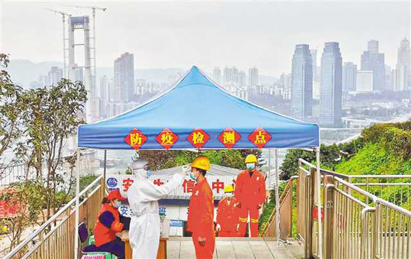 二月二十九日,在中鐵隧道三處重慶軌道交通十號線二期七星崗項目部,工人們正拉開間距排隊測量體溫后進(jìn)入工地。通訊員 周勇 攝