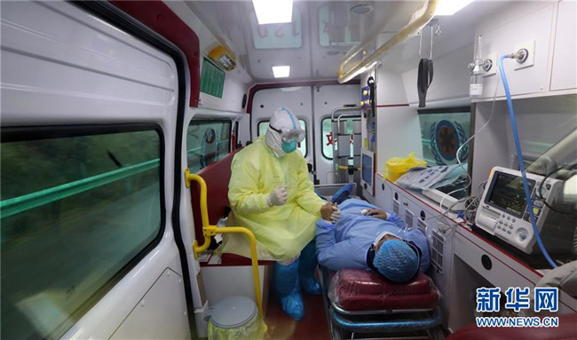 駐守在咸寧中心醫(yī)院的云南醫(yī)療隊(duì)醫(yī)療二組組長(zhǎng)李波趕赴嘉魚(yú)縣人民醫(yī)院,轉(zhuǎn)運(yùn)一名新冠肺炎臨床診斷病例(2月21日攝)。新華社發(fā)(楊崢 攝)