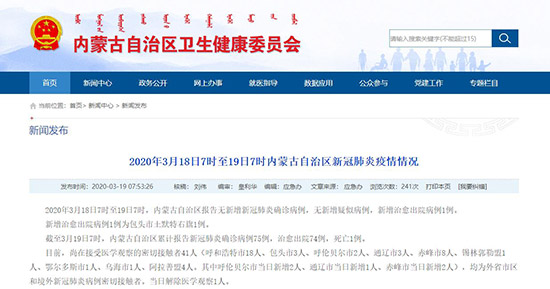 截至3月19日7時(shí),內(nèi)蒙古自治區(qū)累計(jì)報(bào)告新冠肺炎確診病例75例,治愈出院74例,死亡1例。