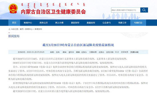 2020年3月27日7時至28日7時,內(nèi)蒙古自治區(qū)報告新增境外輸入新冠肺炎確診病例2例、疑似病例2例。