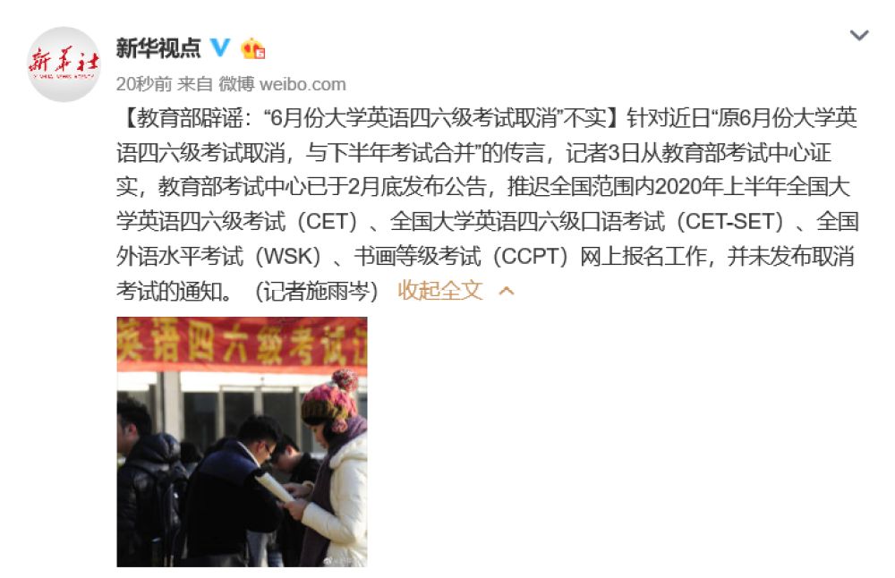 針對近日“原6月份大學英語四六級考試取消,與下半年考試合并”的傳言,記者3日從教育部考試中心證實,教育部考試中心已于2月底發(fā)布公告,推遲全國范圍內2020年上半年全國大學英語四六級考試(CET)、全國大學英語四六級口語考試(CET-SET)、全國外語水平考試(WSK)、書畫等級考試(CCPT)網(wǎng)上報名工作,并未發(fā)布取消考試的通知。