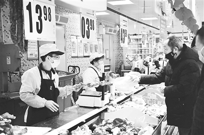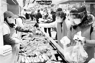 近來,各地采取多種措施,在疫情防控期間保障豬肉市場供應(yīng),滿足居民消費(fèi)需求。圖為市民在河南省鄭州市一家大型超市內(nèi)采購豬肉。新華社記者 馮大鵬攝