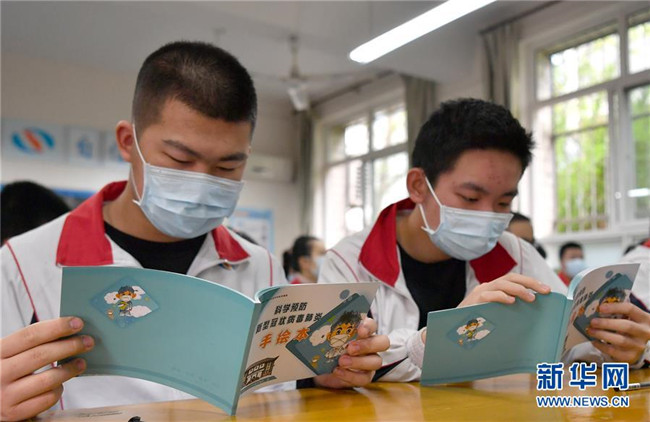 4月7日,西安匯知中學(xué)初三學(xué)生閱讀由學(xué)校老師繪制的防疫繪本。