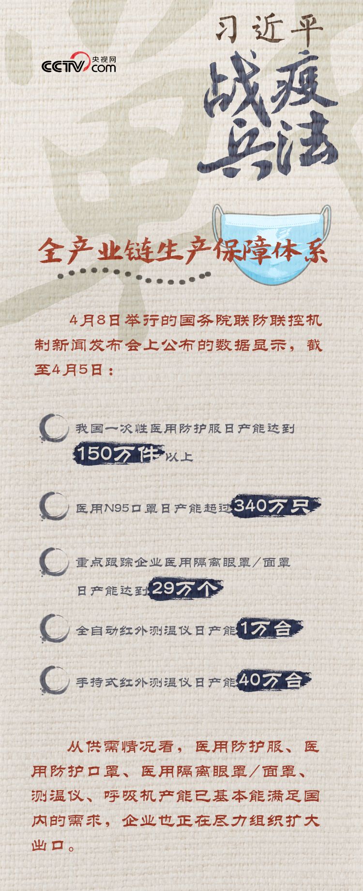 截至4月2日,國務(wù)院聯(lián)防聯(lián)控機制醫(yī)療物資保障組累計為湖北等地區(qū)調(diào)撥了醫(yī)用防護(hù)服超過800余萬件,醫(yī)用隔離面罩(眼罩)165萬個,免洗手消毒液357噸,手持紅外測溫儀66萬臺,負(fù)壓救護(hù)車1000余輛,呼吸機等醫(yī)療救治設(shè)備超過了7萬臺套。