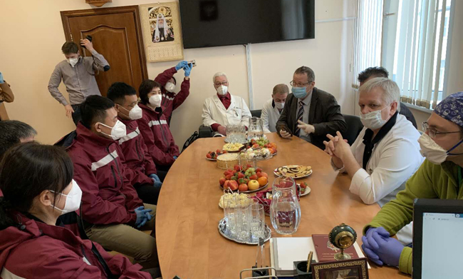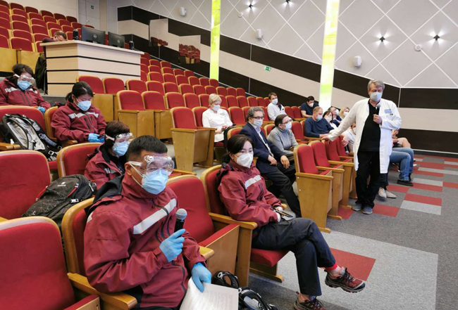 7天時間專家們已經(jīng)在當?shù)氐?家醫(yī)院與醫(yī)學(xué)界同仁分享了經(jīng)驗,還通過視頻連線向在俄華僑華人、中資企業(yè)和留學(xué)生代表講解新冠防控科普知識,解答相關(guān)問題,并交接了防疫物資。
