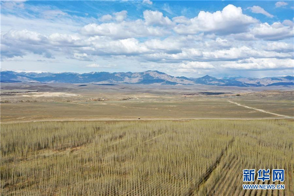 與阿勒泰市中水回用環(huán)境治理示范園林地一路之隔的就是戈壁灘(4月19日攝,無人機照片)。新華社記者丁磊攝