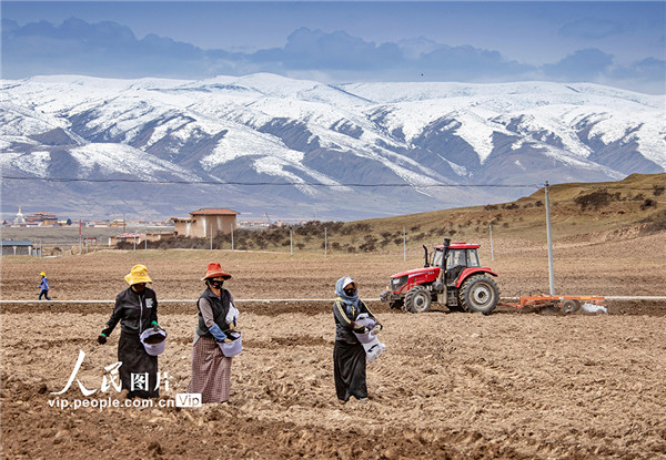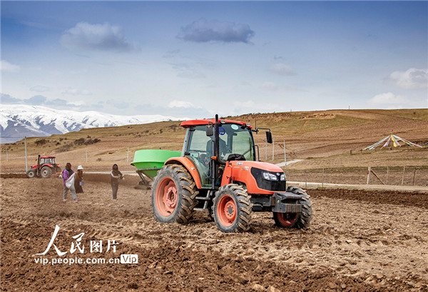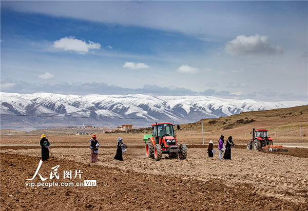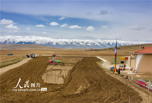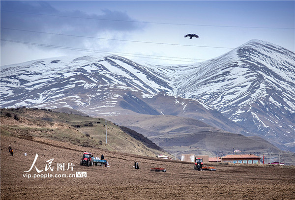 2020年4月26日,四川省阿壩州阿壩縣四洼鄉(xiāng)四洼村,農(nóng)民正在田里忙著耕地施肥,田間地頭呈現(xiàn)一派繁忙景象。劉國(guó)興/人民圖片
