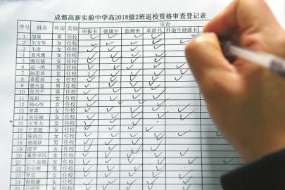 成都高新實驗中學(xué)工作人員對高2018級2班學(xué)生進行返校資格審查登記。