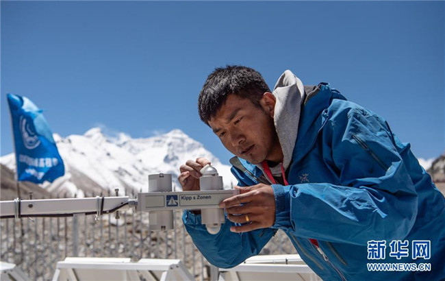 西藏自治區(qū)氣象局工作人員在珠峰大本營自動(dòng)氣象站記錄氣象數(shù)據(jù)(5月10日攝)。新華社記者 普布扎西 攝