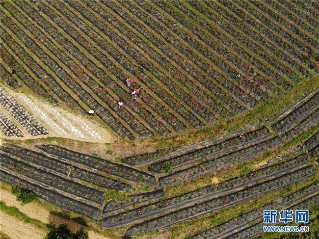 5月14日,在貴州省畢節(jié)市百里杜鵑戛木管理區(qū)中塘村鮮花基地,村民在采摘鮮花(無人機照片)。新華社發(fā)(韓賢普 攝)