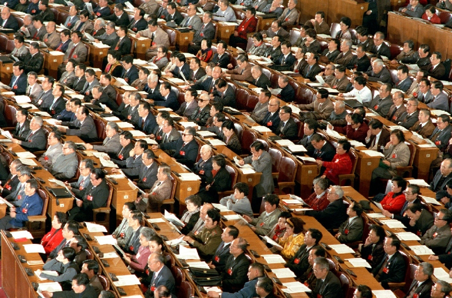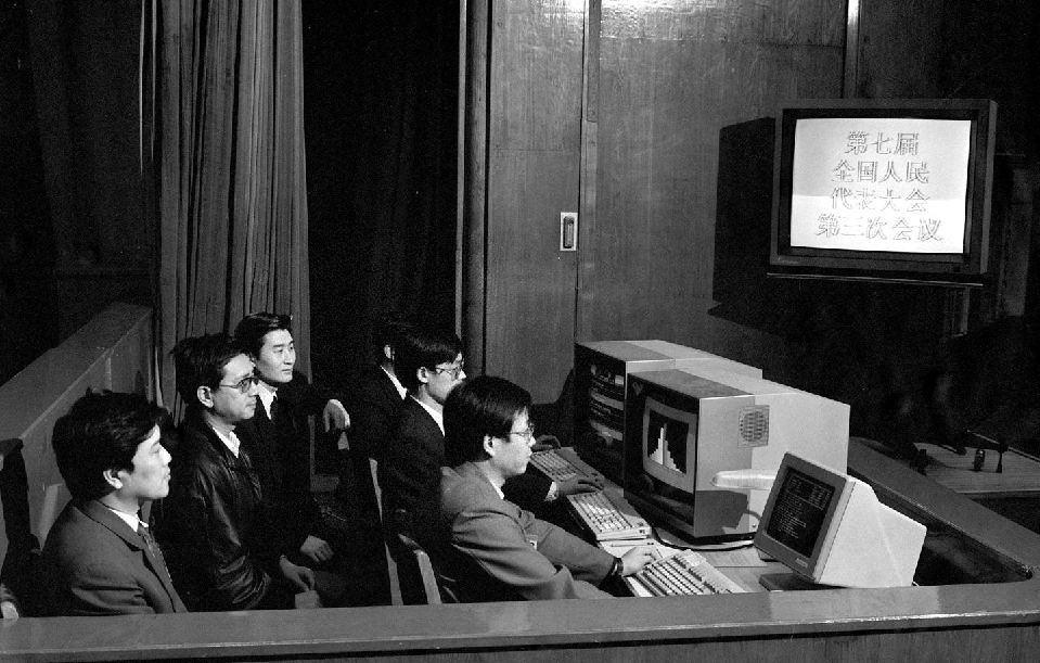 1990年3月,工作人員在七屆全國(guó)人大三次會(huì)議上監(jiān)視電子表決系統(tǒng)的運(yùn)轉(zhuǎn)情況。這套電子表決系統(tǒng)有報(bào)到、表決和即席發(fā)言3種功能。這是首次啟用電子表決器。