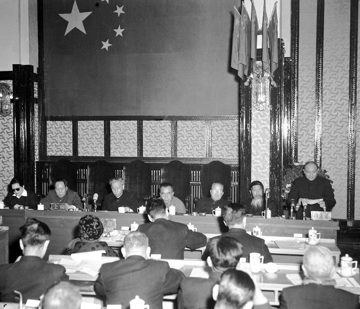 1953年2月11日,中央人民政府委員會(huì)舉行第二十二次會(huì)議。鄧小平(右一)在會(huì)議上作關(guān)于中華人民共和國(guó)全國(guó)人民代表大會(huì)及地方各級(jí)人民代表大會(huì)選舉法的說(shuō)明報(bào)告。主席臺(tái)上(自左起)宋慶齡副主席,毛澤東主席,劉少奇、朱德、李濟(jì)深、張瀾副主席。