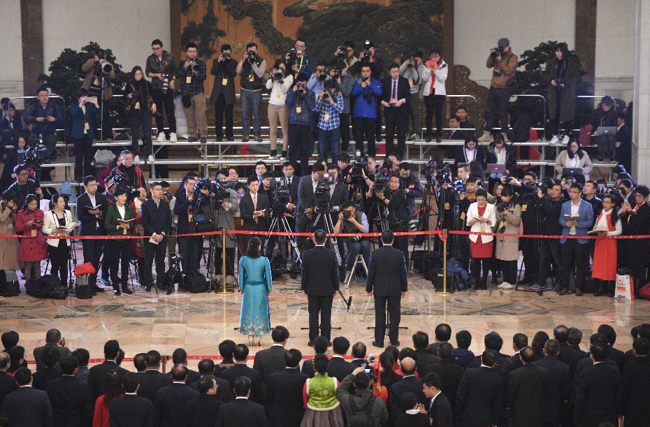 2018年3月20日,十三屆全國(guó)人大一次會(huì)議在北京人民大會(huì)堂舉行閉幕會(huì)。這次全國(guó)兩會(huì)首設(shè)“代表通道”,圖為記者在“代表通道”采訪。