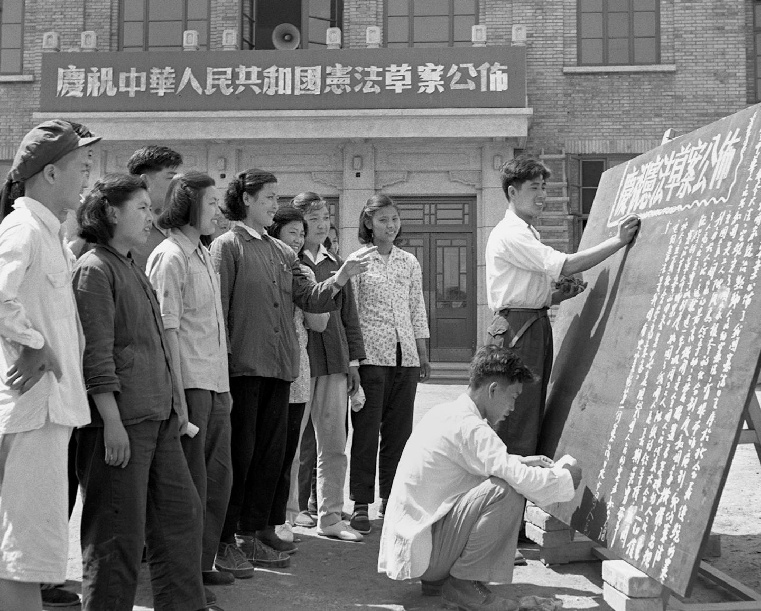 1954年6月,北京市各界人民熱烈擁護(hù)《中華人民共和國(guó)憲法草案》。圖為北京國(guó)營(yíng)第一棉紡織廠工人們,獲悉《中華人民共和國(guó)憲法草案》公布的消息后,立刻出版黑板報(bào)宣傳。