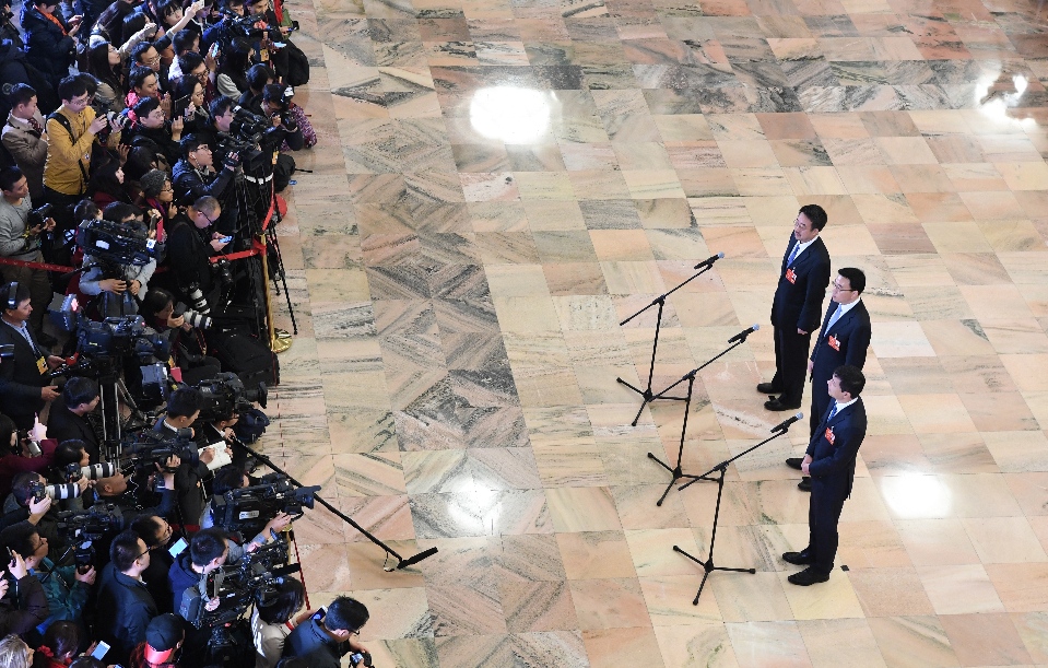 2018年3月15日,全國(guó)政協(xié)十三屆一次會(huì)議在北京人民大會(huì)堂舉行閉幕會(huì)。這次全國(guó)兩會(huì)首設(shè)“委員通道”,圖為全國(guó)政協(xié)委員在“委員通道”接受采訪。