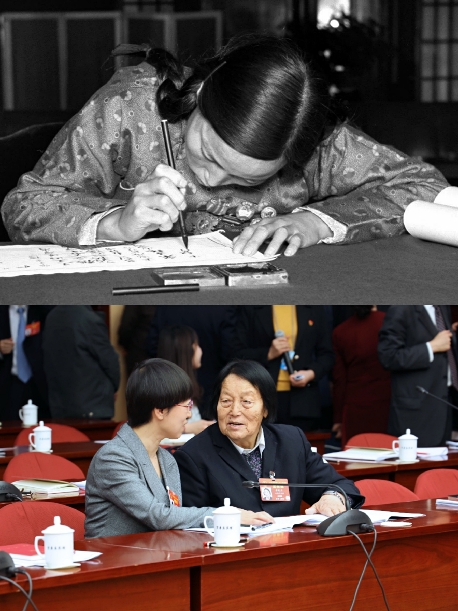 申紀(jì)蘭用她半生時(shí)間見證了中國(guó)民主法制建設(shè)的進(jìn)程。上圖為出席第一屆全國(guó)人民代表大會(huì)第一次會(huì)議的人大代表申紀(jì)蘭在報(bào)到(1954年9月攝);下圖為她(右)在十三屆全國(guó)人大二次會(huì)議山西代表團(tuán)會(huì)議間隙與青年代表交流(2019年3月攝)。