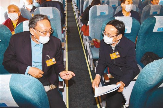5月20日,全國政協(xié)委員、西藏人民醫(yī)院副院長格桑羅布(左)與全國政協(xié)委員、西藏大學(xué)科研處處長圖登克珠在前往北京途中就如何在全國兩會上建言獻策、履職盡責(zé)進行交流。本報記者 旦增西旦 攝