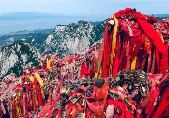 關(guān)內(nèi)關(guān)外登山路兩側(cè)鐵索上情侶鎖、平安鎖,重重疊疊,紅繩彩線迎風(fēng)搖曳,寄托了大家種種情思和愿望,形成了獨特的鎖文化。