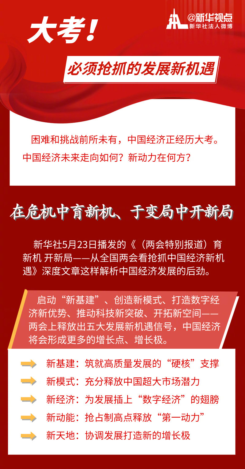 啟動“新基建”、創(chuàng)造新模式、打造數(shù)字經(jīng)濟新優(yōu)勢、推動科技新突破、開拓新空間——不斷涌現(xiàn)的新機遇、新趨勢,正匯聚起不竭新動能,推動中國經(jīng)濟乘風(fēng)破浪、行穩(wěn)致遠(yuǎn)。