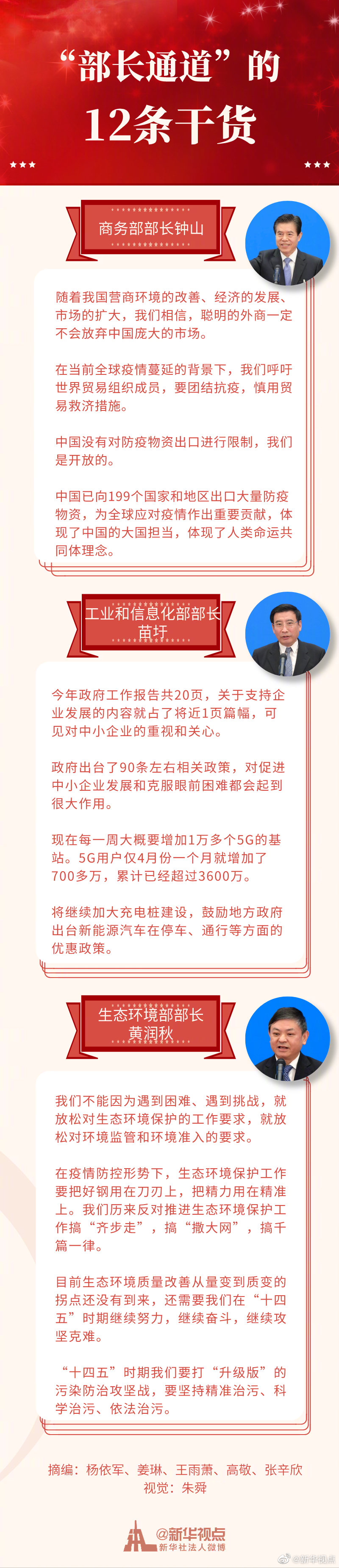 原標(biāo)題:今天的“部長通道”,12條干貨! 5月25日,商務(wù)部部長鐘山、工業(yè)和信息化部部長苗圩、生態(tài)環(huán)境部部長黃潤秋亮相全國兩會(huì)“部長通道”。新華視點(diǎn)微博為你總結(jié)了12條干貨,請(qǐng)看↓