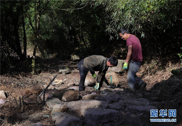 5月25日,工人在修復大相嶺茶馬古道。新華社記者江宏景攝