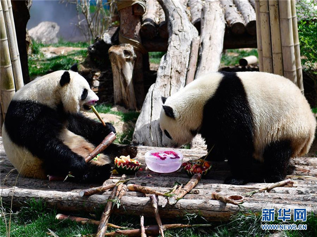 5月31日,兩只大熊貓?jiān)谙碛脙和?jié)“大餐”。 新華社記者 張龍 攝