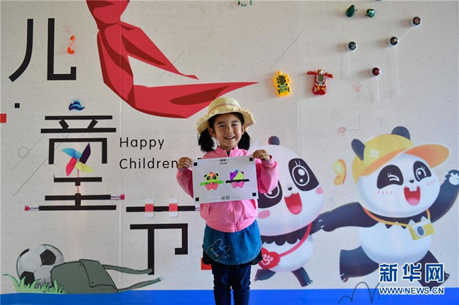 5月31日,一位小朋友在西寧熊貓館內(nèi)展示自己的熊貓主題畫作。 新華社記者 張龍 攝