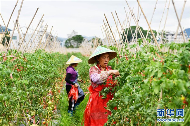 6月1日,農(nóng)民在貴州省榕江縣車江壩區(qū)管理西紅柿。新華社記者 楊文斌 攝