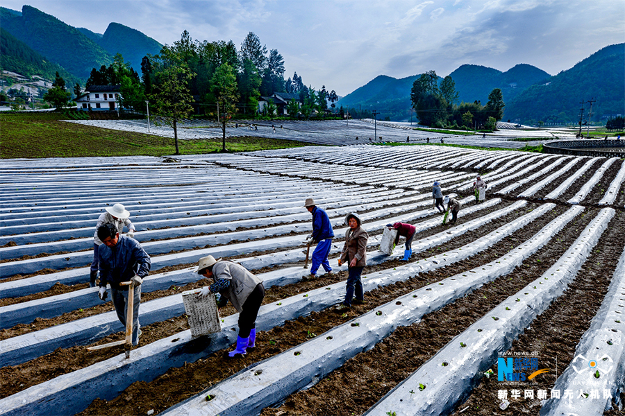 奉節(jié)縣興隆鎮(zhèn)廟灣鄉(xiāng)村的村民正忙著移栽烤煙幼苗。新華網(wǎng)發(fā)(何川 攝)