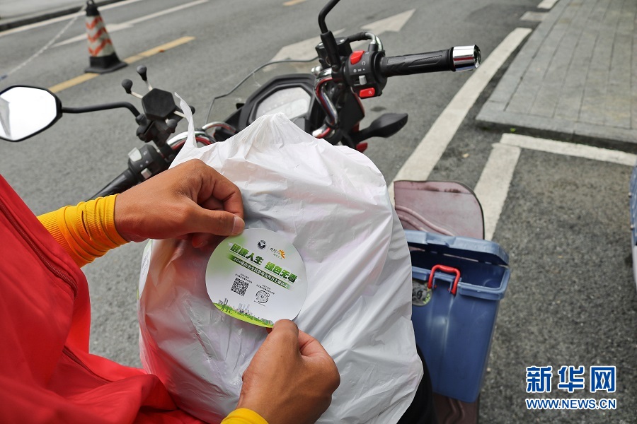 到達(dá)第一單的配送地后,周歡細(xì)心地為外賣(mài)貼上禁毒宣傳貼紙并迅速跟顧客取得聯(lián)系。新華網(wǎng)發(fā) (滕華 攝)