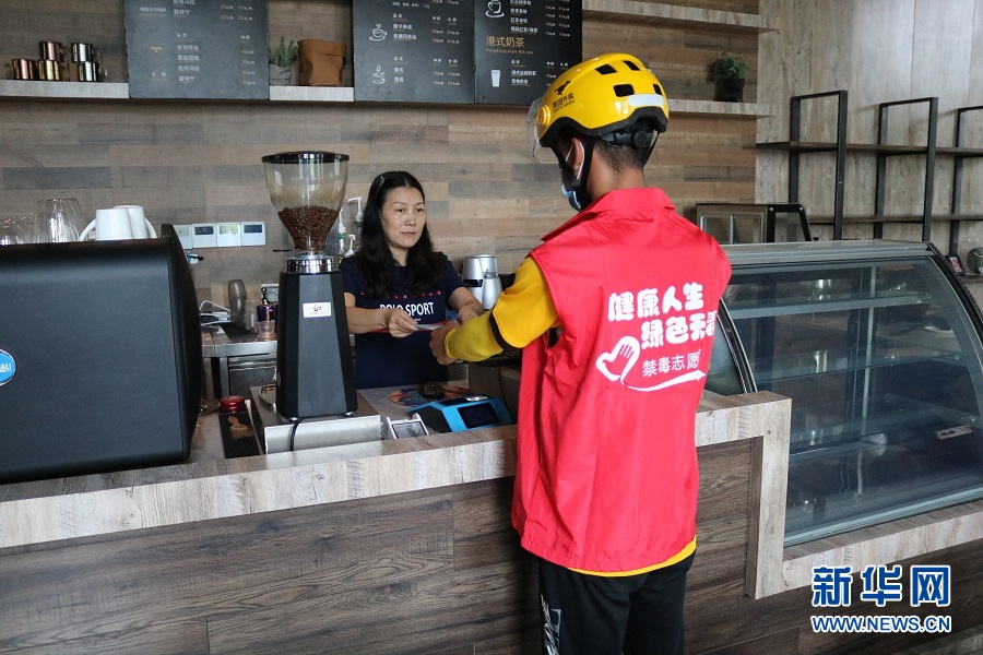 送完這一單后,周歡匆匆趕往下一個(gè)送餐點(diǎn)。“未來(lái),將有更有人在點(diǎn)外賣(mài)時(shí),不僅會(huì)收到美食,還會(huì)收獲一份特殊的‘禁毒外賣(mài)’”。新華網(wǎng)發(fā) (滕華 攝)
