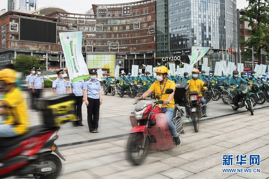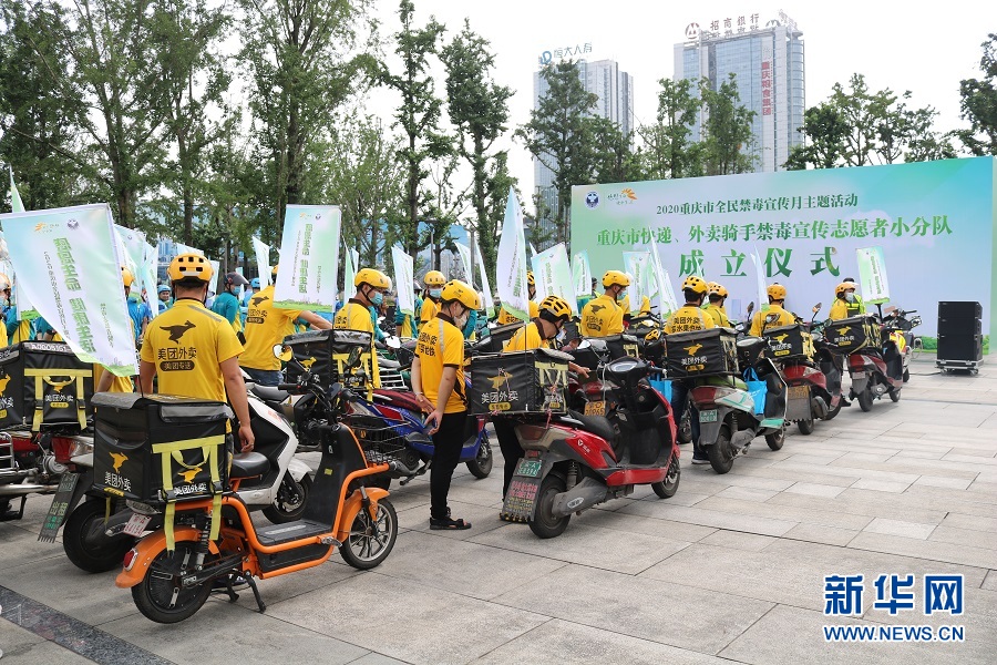 重慶市快遞、外賣(mài)騎手禁毒宣傳志愿者小分隊(duì)成立。新華網(wǎng)發(fā) (滕華 攝)