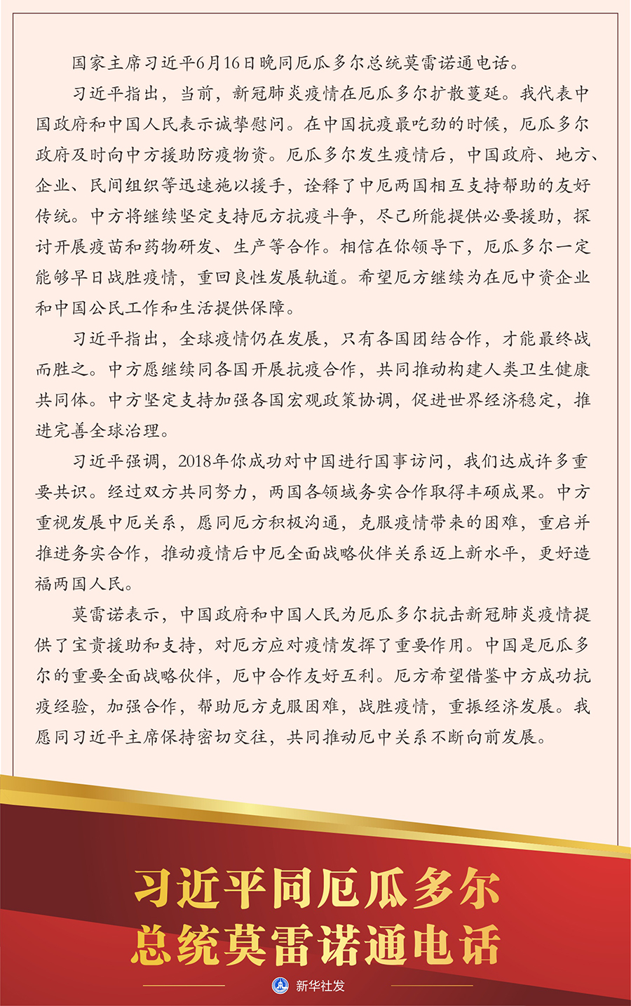 國家主席習近平6月16日晚同厄瓜多爾總統(tǒng)莫雷諾通電話。
