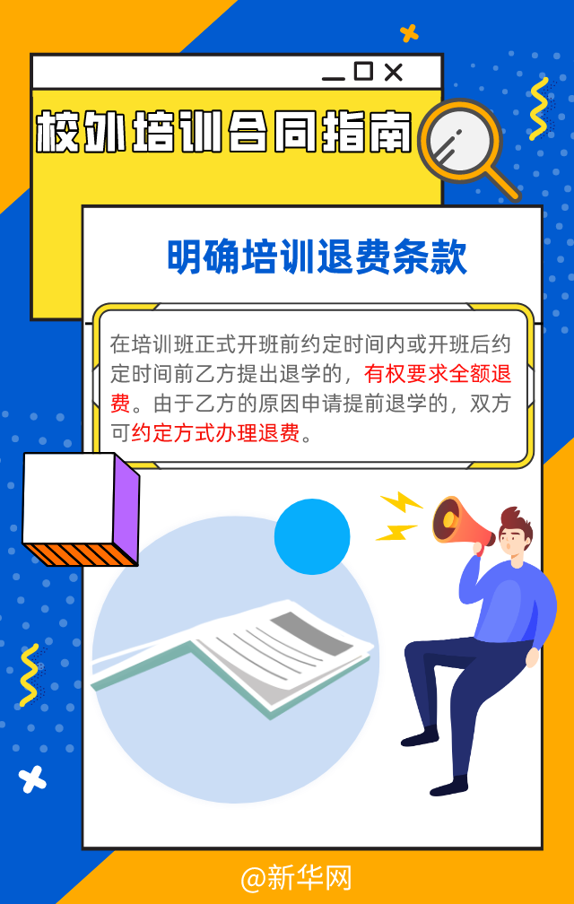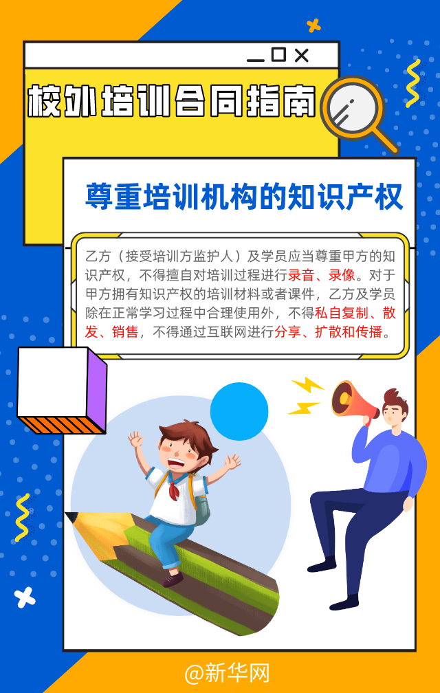 長期以來,校外培訓機構的資質問題,以及部分培訓機構存在違規(guī)收費、退費難、卷款“跑路”現(xiàn)象,這些令學生和家長發(fā)愁。教育部、市場監(jiān)管總局近日發(fā)布《中小學生校外培訓服務合同(示范文本)》,供培訓者(學員)監(jiān)護人與開展中小學生校外培訓的培訓機構簽訂培訓合同時參照使用,為規(guī)范校外培訓做出新的探索。一起來看看,這份“國家版”標準合同有哪些亮點?