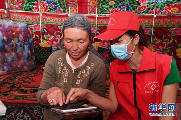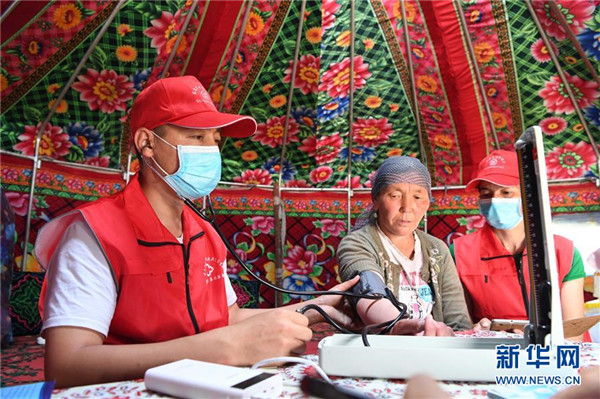6月20日,新疆阿勒泰地區(qū)布爾津縣也格孜托別鄉(xiāng)克孜勒托蓋村村醫(yī)來到布爾津縣黑流灘草原給牧民巴合提古麗·塔拉甫汗檢查身體。圍繞實現(xiàn)人人享有基本醫(yī)療衛(wèi)生服務(wù)目標(biāo),2016年起,新疆布爾津縣開展家庭醫(yī)生簽約服務(wù)工作。該縣組建家庭醫(yī)生簽約團(tuán)隊65個,團(tuán)隊醫(yī)務(wù)人員233名,通過手機(jī)APP、基本公衛(wèi)系統(tǒng)與全縣建檔立卡貧困戶進(jìn)行電子化簽約,提升村醫(yī)隨訪的工作效率和質(zhì)量。截至目前,已完成簽約42936人,履約40043人。新華社記者沙達(dá)提攝