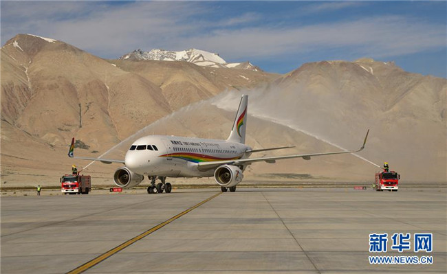 7月1日,西藏航空TV6008客機(jī)降落阿里昆莎機(jī)場(chǎng)穿過(guò)水門。 新華社記者 田金文 攝