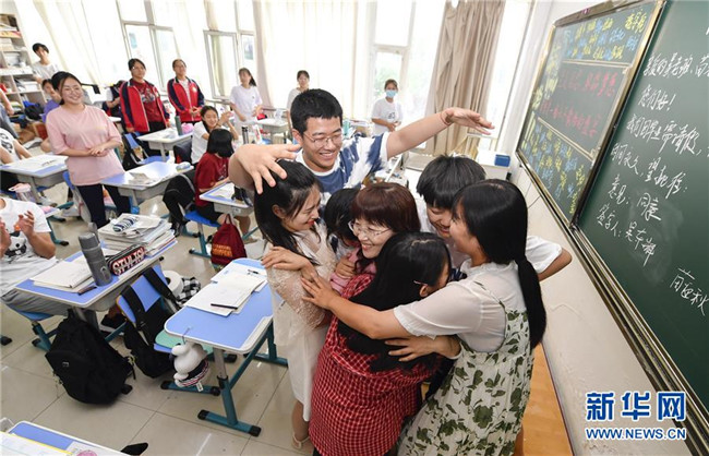 7月6日,吉林省孤兒學(xué)校高三年級學(xué)生與班主任吳東輝相擁慶祝畢業(yè)。 新華社記者 許暢 攝