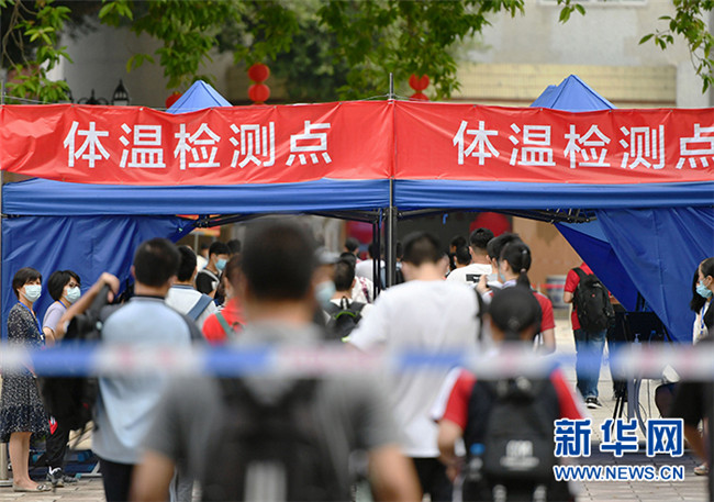 7月7日,在福州第二中學考點,考生進入考場前有序通過體溫檢測點。 當日,2020年高考拉開帷幕。 新華社記者 魏培全 攝