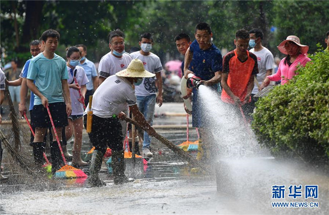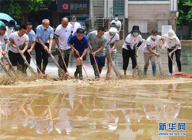 7月12日,融水苗族自治縣文化體育廣電和旅游局清淤小分隊在蘆笙廣場清理地面。新華社記者 黃孝邦 攝