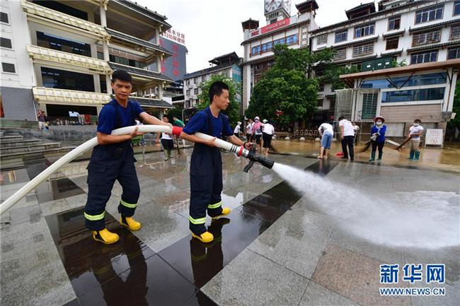 7月12日,融水消防救援大隊的消防隊員在蘆笙廣場沖洗地面。 新華社發(fā)(唐鵬程 攝)