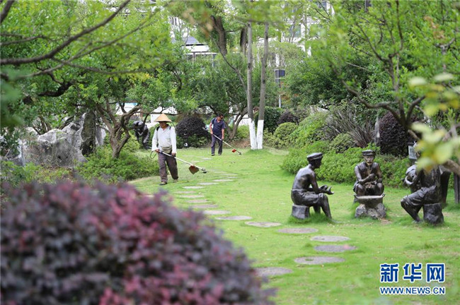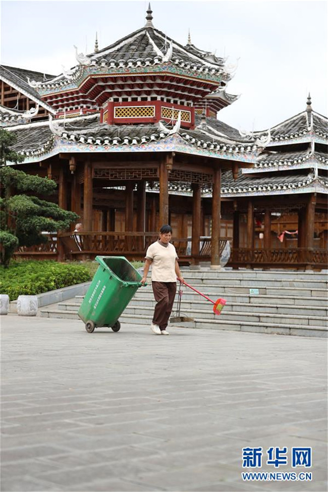 7月19日,在貴州省銅仁市玉屏侗族自治縣田坪鎮(zhèn)侗鄉(xiāng)風情園內(nèi),易地扶貧搬遷群眾在清掃環(huán)境衛(wèi)生。新華社發(fā)(胡攀學 攝)
