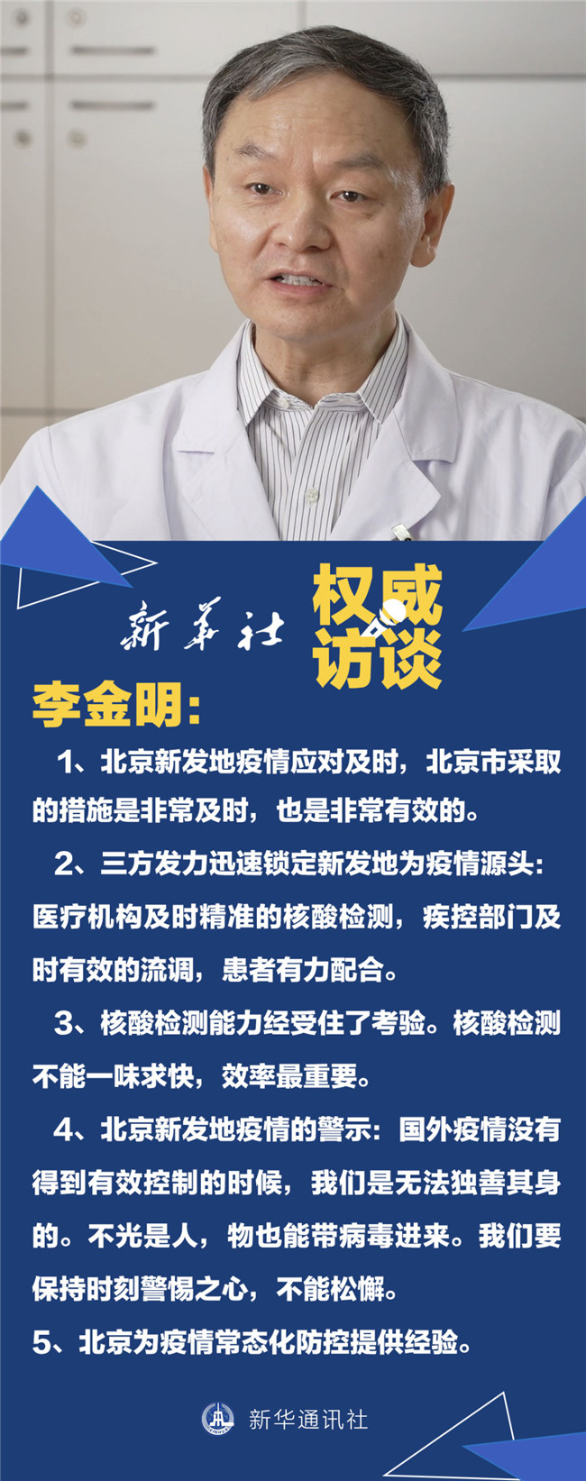 作為國家衛(wèi)生健康委派駐北京專家組專家,從6月13日起,國家衛(wèi)生健康委臨床檢驗(yàn)中心副主任李金明便開始投入緊張的疫情防控工作,對北京提供指導(dǎo),與北京的同仁們并肩作戰(zhàn)。在與病毒傳播賽跑的過程中,北京用最短時(shí)間、最快速度實(shí)現(xiàn)了抗疫的全城動(dòng)員、全民行動(dòng)。