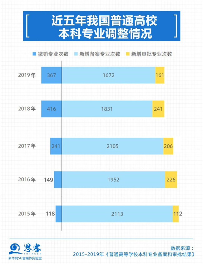 4近五年我國普通高校本科專業(yè)調整情況 近年來,隨著經(jīng)濟社會的不斷發(fā)展,高校的專業(yè)設置也在不斷更迭,可供選擇的專業(yè)也越來越多。2015年開始,全國高校每年增設專業(yè)數(shù)量在2000個左右,撤銷專業(yè)的數(shù)量也超過100個。